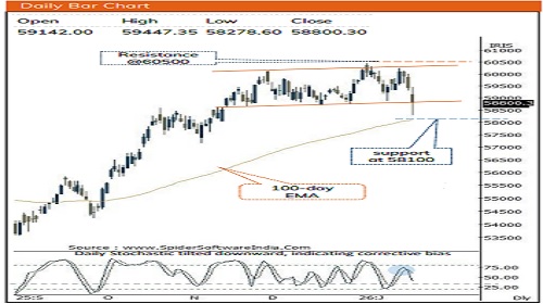 * Key point to highlight is that Index rebounded after taking support in vicinity of 100-day EMA indicating buying demand at lower levels. Going ahead, we believe follow through action above previous session high could open the path for technical pullback towards 59500, failure to do so will led to a consolidation in the 58,100-60000 range. Key support for index is placed at 58100 being 100-day EMA