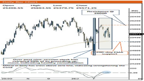 * Hence, any decline from current level should be used to build a quality portfolio wherein focus should be on accumulating key beneficiaries of trade deal of India with US & European Union. In the process, strong support is placed around 25,200 being 200- day EMA coincided with 61.8% retracement of recent up move (24572-26341).