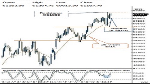 * Volatility is likely to remain elevated on the backdrop of geopolitical uncertainty. Therefore, any corrective declines from current levels should be viewed as buying opportunities as strong demand zone is identified near 59,700, being 50-day EMA and 61.8% retracement of the current up move (57,783-61,674).