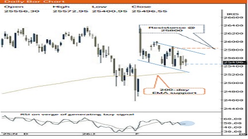 * The index exhibited a range bound activity over a second session in a row. However, noteworthy point is that, the absence of follow through weakness to last weeks sizable bear candle suggest that selling pressure is losing it’s grip. Hence, going forward, a decisive close above upper band of falling channel (placed at 25800) would be the key monitorable that would open the door for a meaningful pullback towards 26300 in the coming month. Failure to do so would result into prolongation of consolidation in 25800-25200 range wherein stock specific activity would prevail.