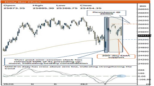 * Index opened with a positive gap-up, however profit booking emerged near the 80% retracement of the prior decline (26009- 25444). The daily price action has formed a sizeable bear that has engulf prior three session range, reflecting near-term profit booking and heightened volatility at higher levels.