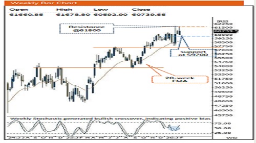 * Key point to highlight, index retraced 61.8% of prior 3 days rally, while sustaining firmly above the 20-day EMA, signaling healthy profit booking after sharp upmove. Going ahead we expect Index to consolidate in the range 59700- 61700 in coming weeks.