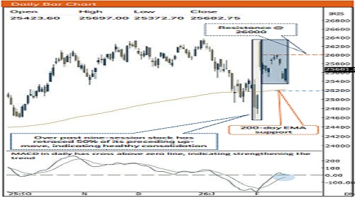 • The Index open the week on a flat note; however supportive efforts emerged around 50% retracement level of previous up-move(24,679- 26,341), coinciding with positive gap up zone recorded on 3rd February, 2026 . As a result, the daily price action formed a strong bullish engulfing candle, indicating buying demand emerged from elevated levels.
