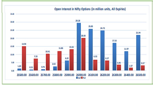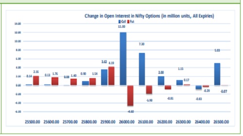 Highest OI build-up is seen at 26000 strike Calls and 26000 strike Puts, to the tune of 29.28mn and 20.00mn respectively.