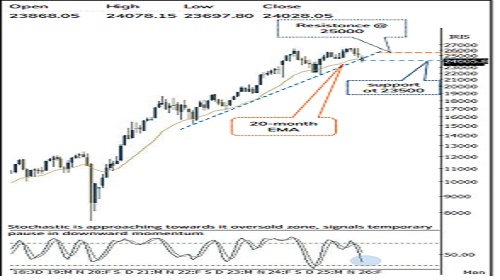 * Index is set for a strong gap-up opening today, tracking a sharp recovery in global sentiment regarding a potential de-escalation of geopolitical concerns and decline in crude oil prices. Going ahead, index need to fill the Monday's gap and decisively close above the 24400 mark to confirm the pause in corrective bias that would open the door for pullback towards initial milestone of 25000-25200. Further, sustainability in crude oil prices at lower levels along with development on geopolitical de-escalation would boost the market sentiment. However, in the process bouts of volatility cannot be ruled out, wherein key support is placed at 23,500 levels based on following observations: