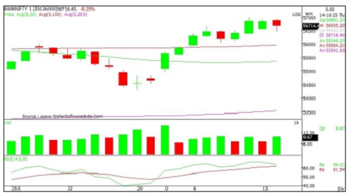 Bank Nifty’s next immediate resistance is around 56950 levels on the upside and on a decisive close above expect a rise to 57180-57340. There is an immediate support at 56470-56230 levels.