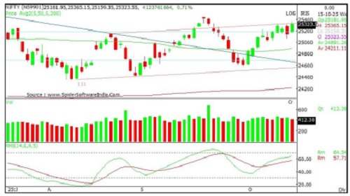 Action: Nifty has an immediate Resistance at 25400 and on a decisive close above expect a rise to 25500-25640 levels.