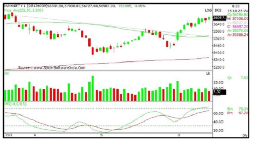 Bank Nifty’s next immediate resistance is around 57180 levels on the upside and on a decisive close above expect a rise to 57500-57680. There is an immediate support at 56740-56400 levels.