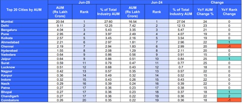 The top 20 cities’ contribution to Industry AUM increased in June ‘25 (YoY). Mumbai, Delhi, Bengaluru, Pune, Kolkata, Chennai and Ahmedabad were the top 7 cities respectively contributing to AUM. Ahmedabad, Jaipur, Bhopal and Chandigarh improved in AUM Ranks.