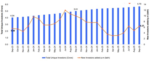 The total investor count rose to 5.70 crore in September 2025. 6.37 lakh investors were added in September 2025. 69 lakh new investors were added in the last 12 months vs 97 lakh in the same period last year.