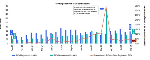 The New SIP Registrations in September stood at 57.73 Lakhs. SIP discontinuations as % of registered SIPs down to 76% in September 2025.