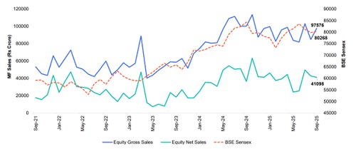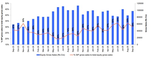 The SIP Flows as % of Equity Gross Sales is Rising Since June 2024. From around 20% in June 2024, it has now touched 30% in September 2025.