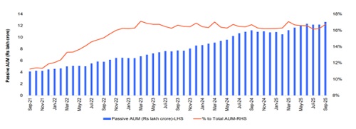 Passive Funds’ AUM touched Rs 12.65 lakh crore in September 2025 from Rs 11.20 lakh crore a year ago (13% growth). The share of passive AUM rose from 11% of total AUM in September’21 to 17% in September’25.