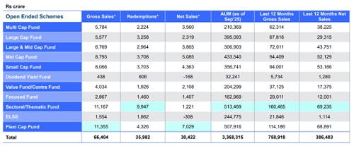 The Sectoral/Thematic Funds category witnessed the Highest gross/net sales over the last 12 months. The segment witnessed inflows to the tune of Rs 69,235 crores. Most equity categories witnessed positive net sales in September 2025. Mid and small cap continue to attract AUM higher than the largecap funds. Mid cap saw inflows worth Rs 5085 crore, smallcap at Rs 4363 crores, whereas largecap funds witnessed inflows Rs 2319 crores. Debt Categories Witnessed Negative Net Flows of Rs 101,977 crores in September 2025 Due to Quarter End. Arbitrage Funds Received Highest Gross/ Net Sales Over Last 12 Months at Rs 143,787 crores.