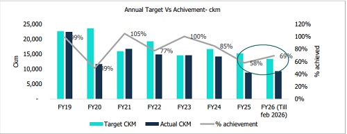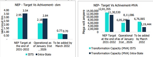 As of January 2026, approximately three-fourths of the targeted ISTS transmission line length has been commissioned, with the balance to be added over the remaining plan period, while Intra-state transmission lines exhibit slightly higher completion levels. However, the transmission expansion continues to miss NEP targets, with annual transmission line additions lower than the targets for the last three years till Feb 2026. During FY25, the addition to the transmission line was 8,830 ckm, 42% below the target of 15,253 ckm.
