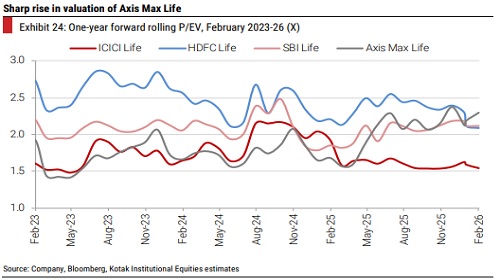 We find tailwinds to the margins of life insurance companies with an increasing share of non-par/annuity, supported by the upward sloping yield curve, following a recent rise in bond yields. Protection growth remains strong; Exhibit 2 shows that growth in sum assured was 52-167% for listed life companies in 3QFY26 and 36-124% in January 2026. The drag of GST (due to ITC loss) is waning faster than expected (Exhibit 4). All of this points toward strong VNB growth in the near term, driving upgrades after the 3QFY26 results (Exhibit 25). 2HFY25 was a weak period following surrender value guidelines; the low base is now providing a boost.