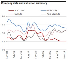 * Bajaj Life reports muted growth. Bajaj Life reported APE growth of 7% in October 2025, similar to 4-9% growth reported in the previous two months. Sum assured growth was also muted at 8%. Growth was largely driven by value (ATS up 6% yoy); NoP was largely flat yoy. The reason for weakness in Bajaj is not clear and will be discussed in the forthcoming earnings call.