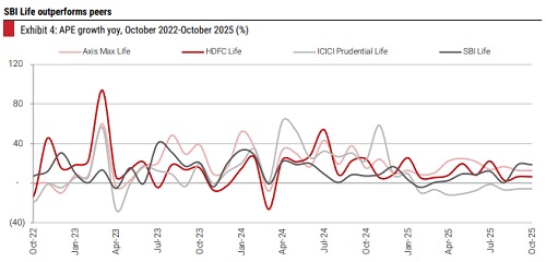 * SBI Life sustains momentum. SBI Life reported 20% APE growth in October 2025 and 19% in September 2025, up from 0-12% reported in the previous five months. Growth was largely driven by a pickup in ticket sizes (up 14% yoy); NoP growth was moderate at 5% yoy. Sum assured growth was also strong at 45% yoy.