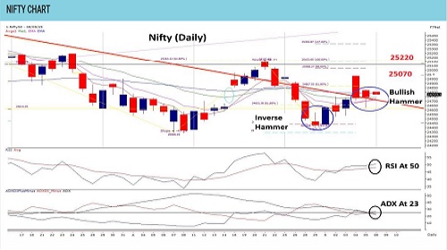 The occurrence of an Inverse Hammer near the 24400 zone signalled the end of the recent corrective phase and helped define a fresh demand base between 24400–24500. This base was further reinforced by the appearance of a Bullish Hammer in the final session of the week, establishing a strong support marker around 24600. Momentum indicators reflect a phase of consolidation, with the RSI steady near 50 and the ADX below 25, indicating subdued trend strength. At the same time, multiple moving averages and robust Put OI concentration at 24500 add weight to this demand band. On the upside, a decisive breakout above the 25000–25220 zone would be crucial to unlock further momentum. Notably, the Inverse Hammer also aligns with the 88.6% Fibonacci retracement of the 24344– 25154 move, suggesting that near-term price action may oscillate within the 25220–24500 range. For the September series, the undertone remains broadly positive. However, a confirmatory close above the latest Bullish Hammer is an immediate prerequisite for the up move to extend towards the 25070–25220 zone in the coming weeks. On the flip side, maintaining 24600–24500 as a firm support is critical to preserving the bullish structure.