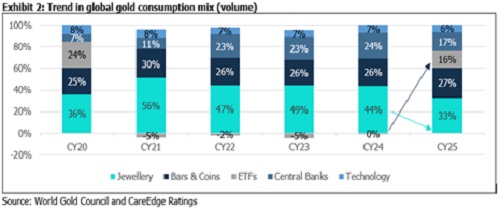 According to CareEdge Ratings, investment share in India’s gold consumption rises to 42% in CY25 from 29% in CY24. Investment demand surged to record levels globally and in India led by gold ETFs and bar-and-coin buying, reflecting safe-haven demand, diversification motives and geopolitical uncertainty.