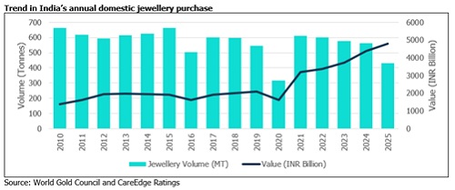 CareEdge Ratings notes that Indian jewellery demand remains resilient despite record gold prices with jewellery purchases rising ~10% y-o-y to Rs.4.8 lakh crore in CY25, reflecting consumers’ willingness to allocate higher wallet share to jewellery. Indians’ total spending on jewellery purchases has grown at a healthy compounded annual growth rate (CAGR) of 11% over CY21-CY25 indicating continued appetite for the yellow metal. Though on value basis demand remained resilient, volume has declined by 15% in CY25, which is reflective of the price-sensitive nature of jewellery demand, where preferences shifted towards lower-carat/lighter-weight jewellery.