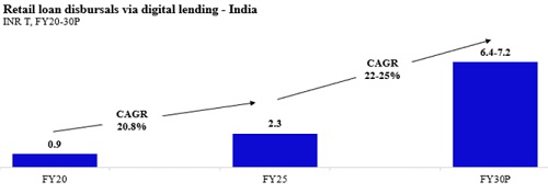 * As of FY25, India’s retail loan disbursal via digital lending stood at Rs.2.3tn and grew at a CAGR of 21% from FY20. The segment is expected to grow at a CAGR of 22–25% till FY30, with growth driven by the younger generation and rising household earnings (Source: 1Lattice analysis).