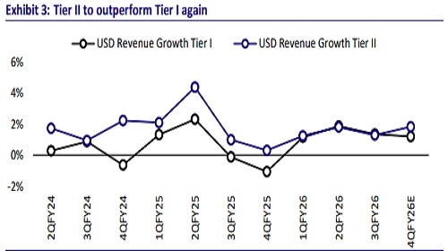 * We expect revenue growth of 1.5% QoQ CC for TCS and 1.0% for WPRO, driven by a two-month inorganic contribution from the Harman acquisition. INFO/HCLT are likely to report 0.7%/0.9% revenue decline in 4QFY26, due to 2H being weaker than 1H as front-ended growth/seasonality in software. TECHM may post 0.5% QoQ growth, while LTIM could report 1.5% CC growth, aided by continued large-deal ramp-up.