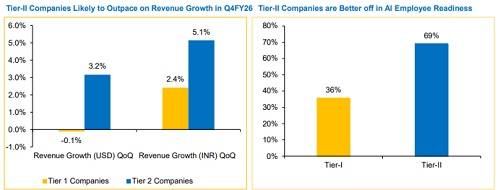 IT services companies are likely to report a resilient Q4FY26E, aided by the reversal of furloughs, stable deal ramp-ups, continued vendor consolidation, and a healthy AI-led pipeline, despite macro headwinds and rising GenAI disruption concerns. Further, the ~2.5% QoQ depreciation in average INR against the USD is expected to provide a meaningful translation tailwind to reported INR revenues and margins. Supportive cross-currency movements should also add ~0% to 0.5% sequential uplift to USD revenues.