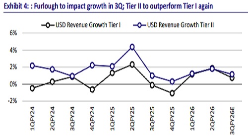 * We expect revenue growth of 0.5% QoQ CC for TCS and 0.3% for INFO, driven by seasonal furloughs, with 2H weaker than 1H as growth was front-ended, in line with prior years. HCLT is anticipated to clock healthy growth of 2.3% in 3QFY26, driven by seasonality in its software business. WIPRO is likely to report 1.5% QoQ CC, organically at the mid-point of guidance, supported by inorganic contributions of HARMAN. TECHM is expected to post 0.5% QoQ growth, while LTIM is likely to report 2.2% CC growth, aided by continued large-deal ramp-up.
