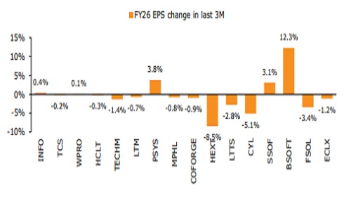We expect IT Services companies to deliver a muted albeit steady sequential growth in Q4, on the back of lesser working days and a demand environment that remains constrained by client caution and evolving tech priorities. Among verticals, BFSI is likely to maintain positive momentum in Q4, whereas recovery in Healthcare, Manufacturing, Hitech, and Retail remains uneven, with elevated macro uncertainties clouding the pace of rebound. Tier 1 players LTM, TCS, WPRO, and TECHM would lead sequential revenue growth in our view, while INFO and HCLT would report decline due to the usual seasonality factor. Within the tier-2 pack, while FSOL, PSYS, MPHL, and COFORGE would lead on revenue growth, HEXT, LTTS, and SSOF are likely to post muted growth. EBITM for our IT universe is likely to be a mixed bag, contingent on wage-hike cycles, restructuring impact, large-deal rampup, business-related seasonality, and M&As, as well as being aided by currency movement. The recent sharp depreciation in the rupee offers a cushion to consensus’ earnings estimates for CY26/FY27 and helps offset some pressures emanating from elevated macro and geopolitical volatility, uncertainties around AI evolution and adoption, changing pricing constructs, and potential deflationary impact on IT budgets. We expect heightened focus on revenue growth guidance, given widespread pessimism and the resultant increased volatility during the earnings season. The NIFTY IT Index has underperformed the broader market by ~10%/5% over the past 3M/6M, due to aforementioned factors. However, the underperformance has partially reversed over the past 1M, with the index outperforming the broader market by ~6% on sharp rupee depreciation, which has improved earnings defensibility. We upgrade COFORGE and ECLX to BUY from Add.