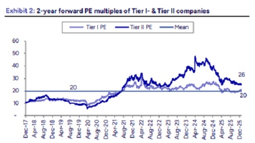 Tier I & II operating performance: We expect Tier II and small-cap companies to outperform Tier I in a seasonally weak quarter. Tier II firms are likely to deliver 2.6% QoQ CC revenue growth, led by PSYS. Within Tier I, HCLT and LTIM are expected to post relatively stronger growth of 3.0% and 2.0% QoQ CC, respectively, though the Tier I median growth is likely to remain modest at ~1.0% QoQ CC. Among small caps, LATENTVI is expected to stand out with robust 7.1% QoQ CC growth, supported by sustained momentum in the BFSI and Retail & CPG segments.