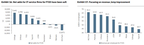 INFO and MPHL remain our top picks: We favor INFO in the large cap space for its stable management, top revenue per employee among large caps in the past four years, No 1 ranking in the Forrester Wave AI technical Services Q4CY25 report in terms of strategy. It also offers superior low double-digit earnings growth vs peers during FY26-28E. At ~16x FY28E earnings, valuation remains attractive. We value INFO at 19x FY28E earnings to arrive at a lower TP of INR 1,600 per share. In the mid-cap space, MPHL stands out amid robust technology spending across BFSI (US top banks tech spend up 9% YoY in Q4CY25). With 60%+ revenue mix from BFSI, it is well-positioned. We expect an CAGR earnings of 16.5% during FY26-28E; the stock trades at 17x FY28E earnings, and we value it at 21x on FY28E earnings to arrive at a lower TP of IN 2,760 per share.