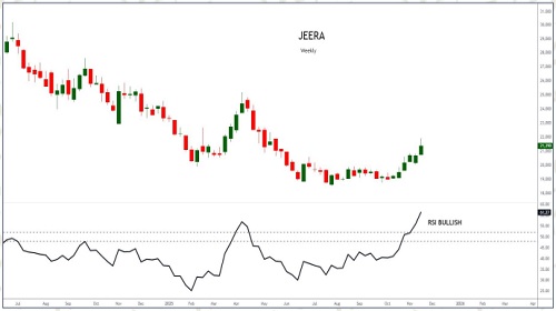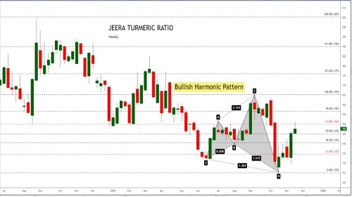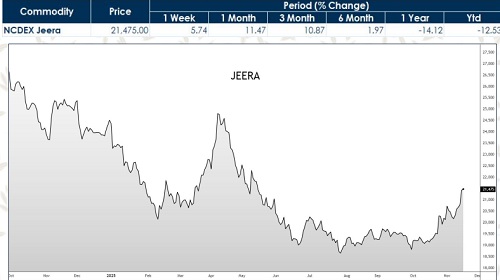 Price Performance: Jeera gained over 10% this month, supported by extremely low arrivals and delayed sowing across Gujarat and Rajasthan. Weather disruptions, uneven rainfall and unstable field conditions restricted acreage expansion, while improved Gulf and Chinese buying helped sustain firmness despite overall price-sensitive export sentiment.