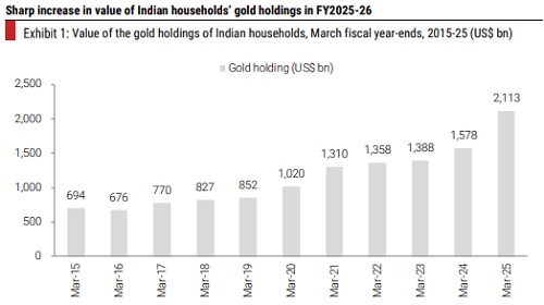 Indian households have seen a sharp increase in the value of their gold stock, the bulk of which is in the form of jewelry (see Exhibit 1). However, the ‘wealth effect’ may be much lower, given the premiums households pay in the form of (1) making charges and (2) precious stones, which have seen steady price corrections that would have offset part of the gains from the sharp rise in gold prices (see Exhibit 2). We estimate 10.3% IRR for household gold jewelry purchases over FY2011-1HFY26 versus the 12.5% CAGR in gold prices (fiscal average) on INR basis over this period (see Exhibit 3).