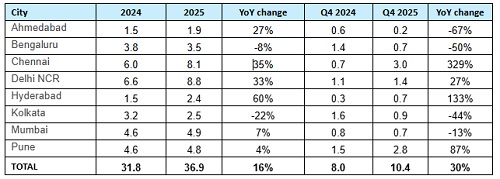 With 36.9 million sq ft of leasing in 2025, industrial & warehousing demand across the top eight cities remained strong, witnessing a 16% YoY growth. During the year, Delhi NCR led the demand with 24% share, closely followed by Chennai at 22% share. On a quarterly basis, after a relatively modest third quarter, Q4 2025 saw about 10.4 million sq ft of industrial & warehousing demand. Chennai, closely followed by Pune, cumulatively accounted for 56% of the quarterly demand.