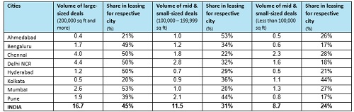 Interestingly, on a quarterly basis, within the E-commerce segment, about 61% of the industrial & warehousing space uptake was through large deals, driven by large storage requirements of fulfillment centers and delivery hubs. On the contrary, more than two-thirds of deals in the FMCG and Retail segments were in the mid-sized category (100,000-200,000 sq ft), driven by the growing popularity of hyperlocal delivery firms.