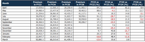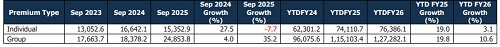 Group premiums rose significantly by 35.2% in September 2025, increasing from a 4.0% growth in September 2024. The increase was largely supported by a rise in the group's non-single segment, mainly due to significant traction by LIC. Meanwhile, individual premiums fell by 7.7%, compared with a 27.5% rise in the same month last year. Additionally, the market share of single premiums declined marginally from 70% in FY25 to 69% up to H1FY26, which could indicate a gradual shift in business composition towards the latter. Private insurers have managed this transition well by sustaining growth through diversified, recurringpremium offerings.