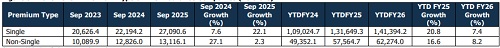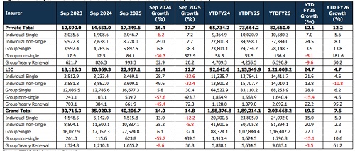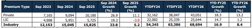Private insurers saw a 17.7% rise in new business premiums in September 2025, while LIC increased by 12.7%. The industry's overall growth was largely due to a growth in group non-single premiums. LIC’s group business witnessed a healthy recovery in September 2025, after a brief moderation in August 2025. The segment appears to be stabilising, with the high base effect stemming from last year’s regulatory changes largely normalising by now. Overall, the life insurance industry’s YTDFY26 growth moderated to 7.6% from 19.5% last year. Private insurers maintained steady growth of 12.2%, supported by performance in group segments.