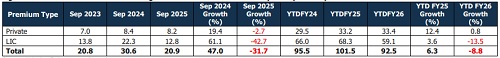 In September 2025, despite a recovery in new business premiums, individual non-single policies declined significantly by 31.7%, compared with a 47.0% rise in the same month last year. Private insurers reported a 2.7% decline, while LIC registered a 42.7% fall in September 2025. This decline is attributed to the base effect and surrender value regulations. This decline is expected to normalise next month onwards. Private players have been able to offset the decline in policies by increasing the premiums received per policy.