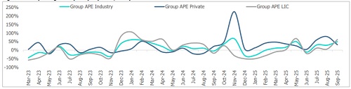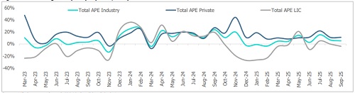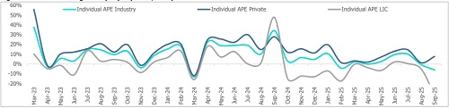 According to Sanjay Agarwal, Senior Director, CareEdge Ratings, “The Indian life insurance industry’s APE growth moderated to 5.2% in September 2025, lower than the 6.6% rise seen in August and well below the base of September 2024. However, the implementation of the GST waiver on individual life and health insurance premiums has had some impact, driving improved sales momentum towards the month-end. The industry is now showing signs of recovery, with underlying business growth returning to double digits. Over the medium term, CareEdge expects the sector to sustain a better growth trajectory, supported by favourable regulatory reforms, evolving product innovation, deepening digital reach, and expanding distribution efficiency.