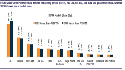 As expected, the life insurance industry reported strong performance during Nov25, with Retail APE growing ~27%, driven by GST rate exemption tailwinds, lower base effect given the festivities during Nov-24, and normalization of the base due to the impact of surrender regulations in Nov-24. The private sector clocked in a strong 28% growth in Nov-25, whereas LIC posted a robust ~23% growth. On 2Y CAGR basis, the industry’s retail APE grew ~16% led by the private sector clocking a solid ~22% growth while LIC posted a muted ~4% growth. YTDFY26, the industry’s retail APE grew ~7%, driven by ~12% growth in the private sector while LIC witnessed a ~2% decline. Among private listed players, SBI Life remained the fastest growing player, logging a sturdy ~33% Retail APE growth, followed by Axis Max Life at ~23% growth. ICICI Pru Life’s reported Retail APE grew ~25% in Nov-25, while RWRP grew ~13%, indicating strong sale of monthly and quarterly premium paying policies. HDFC Life saw ~20% Retail APE growth in Nov-25, while Canara HSBC Life clocked a strong ~26% growth. Group APE for the industry declined 8% in Nov-25, mainly due to ~48% drop seen in the private sector, offset by LIC’s strong 111% growth. Resultantly, overall APE for the industry grew ~16%, with LIC logging a strong ~49% growth, while the private sector reported a muted ~5% growth. With growth expected to pick up in H2FY26, we expect the industry to log ~9-10% Retail APE growth in FY26E, backed by private-sector growth of ~11-12% and LIC likely growing ~4-5%.