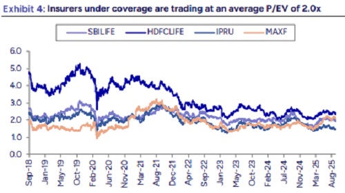GST exemption to impact EV in FY26: We expect the recent GST exemption on life insurance to impact profitability. With the benefit of input tax credit not available to insurers on their existing book, we expect a drag of 20-100 bps on FY26E Embedded Value across players. In our view, covered companies are likely to mitigate the drag with commission cuts/price hikes and we remain watchful of the same.