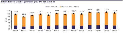 GST e-way bill volumes moderated in Oct-25 (+8% YoY / -4% MoM), as the pent-up demand from pre-festive season and GST rate-cuts lost steam, in addition to an unfavorable base (festive season was in Nov last year). Intra-state volumes were down 2% MoM (up 13% YoY), while inter-state volumes fell 8% MoM and 1% YoY, respectively. We anticipate volume growth will remain healthy going forward on the back of positive trends sustaining in the manufacturing PMI (at 59.2; up by ~150bps MoM in Oct-25). Despite the volatility in volumes, average freight rates on trunk routes were flat sequentially, albeit up 4% YoY (flat on a 3M rolling average basis). Media articles suggest that the government has increased the cost of vehicle fitness tests for older vehicles by up to 10x (Link), which is likely to lead to freight hikes ahead, especially on intra-state routes where higher number of aged trucks ply. Diesel prices have been flat since May25, while ATF prices have grown 4% YoY. Brent crude, meanwhile, has seen a 5% MoM decline in Oct-25