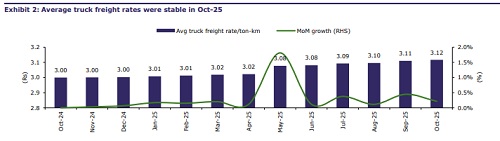 We monitor monthly indicators for assessing freight and cargo movements across multiple modes of transportation. Pent up demand, owing to GST rate cuts and pre-festive season, seems to have petered out in Oct-25 as GST e-way bill volumes declined sequentially (-4% in Oct-25/-1% on a 3M rolling average basis). However, lead indicators like manufacturing PMI suggest volumes are likely to remain healthy going ahead. Truck freight rates and diesel prices have been stable for the past two quarters despite volatility in freight volumes. Volume at major ports continued to witness double-digit growth on a YoY basis for two consecutive months (+12/4% YoY/MoM in Oct-25) led by growth across key commodity segments (POL: +16% YoY; Coal: +22% YoY, container volume: +12% YoY). Container shipping rates have now recovered from a 20- month low in Oct-25, up 6% MoM as on 20-Nov-2025, although they are still ~70% below the highs seen in Jul-24, amid continued geopolitical uncertainties