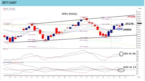 The occurrence of long-wick candlestick patterns indicated indecision rather than strong bearish conviction. A smart rebound in yesterday’s session helped the index reclaim levels above the previous day’s Inverse Hammer, effectively invalidating the near-term bearish setup. A sustained move above 25170 will confirm a breakout, paving the way for an advance towards the 25400–25500 zone. On the downside, any pullback towards 24950 should be seen as a healthy correction within the ongoing consolidation. A decisive break below 24620 would negate the current bullish structure. Until such a breakdown occurs, dips remain buying opportunities, with 24950 acting as a key support zone. Despite global uncertainties and FII outflows, domestic sentiment stays resilient, aided by strength in large-cap IT and Banking names. Overall, a close above 25170 will likely mark the start of a fresh directional momentum phase, reinforcing the medium-term uptrend while a buy-on-dips strategy remains favoured.