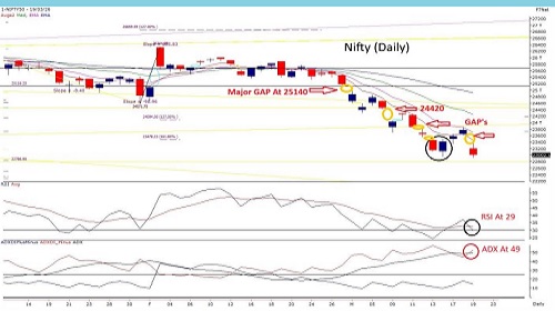 Recurring lower-gap formations continue to signal a fragile market structure amid persistent geopolitical uncertainties. This week’s sharp 900- point pullback was completely sold into within a single session, as Nifty slipped below Monday’s support at 22955, though it managed to close just above the key psychological level of 23000. The ongoing sequence of downward gaps remains a concern. A fresh gap near 23620 now acts as immediate resistance. Earlier, the index attempted to fill the gap around 23840, aligning with the 10-DEMA resistance zone, but failed to sustain and resumed its downward trend. A breakdown below 23500 dragged the index back toward the 23000-support zone, where a Piercing Line pattern is placed, indicating a likely range-bound phase within a broader downtrend. Options data suggests a near-term range between 23000 and 23500. Technically, indicators remain mixed. ADX is trending higher, signalling strong trend strength, while RSI is rebounding from oversold levels, hinting at short-covering rather than fresh buying. A breach below 23000 could open downside towards 22700–22400, while resistance stands near 23630.