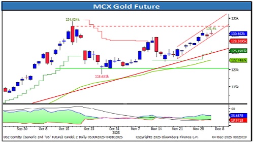 Gold closed with a modest decline in the international market, while domestic prices increased, supported by the weakness of the Indian currency. The rupee slipped to a fresh record low of 90.3040 yesterday and has depreciated more than 1% against the US dollar so far this week. The sharp decline in the rupee helped cushion domestic gold prices from the earlier correction in international markets. As global prices rebounded, the impact of the weaker rupee amplified the gains in the domestic market, resulting in a stronger upside compared to overseas levels.