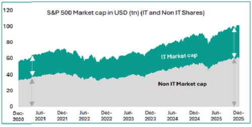 * In S&P 500 Index, IT constitute 70 stocks. AI’s influence has lifted the sector’s share of the total market cap from 27% in 2020 to 33% of its $60tn, fueling fears of AI bubble.