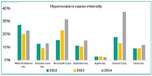 * Hyperscalers are rapidly increasing capital-expenditure intensity, with firms like Microsoft, Oracle, and Meta directing a growing share of revenue toward AI infrastructure, compute, and data-center investments.
