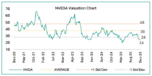 * However, valuations seem justified, as exemplified by NVIDIA, one of the major beneficiaries of AI industry momentum, which trades at 24x 1-year forward PE, a 37% discount to its 5-year average, while its earnings are expected to grow at 57% CAGR between CY25–27E.